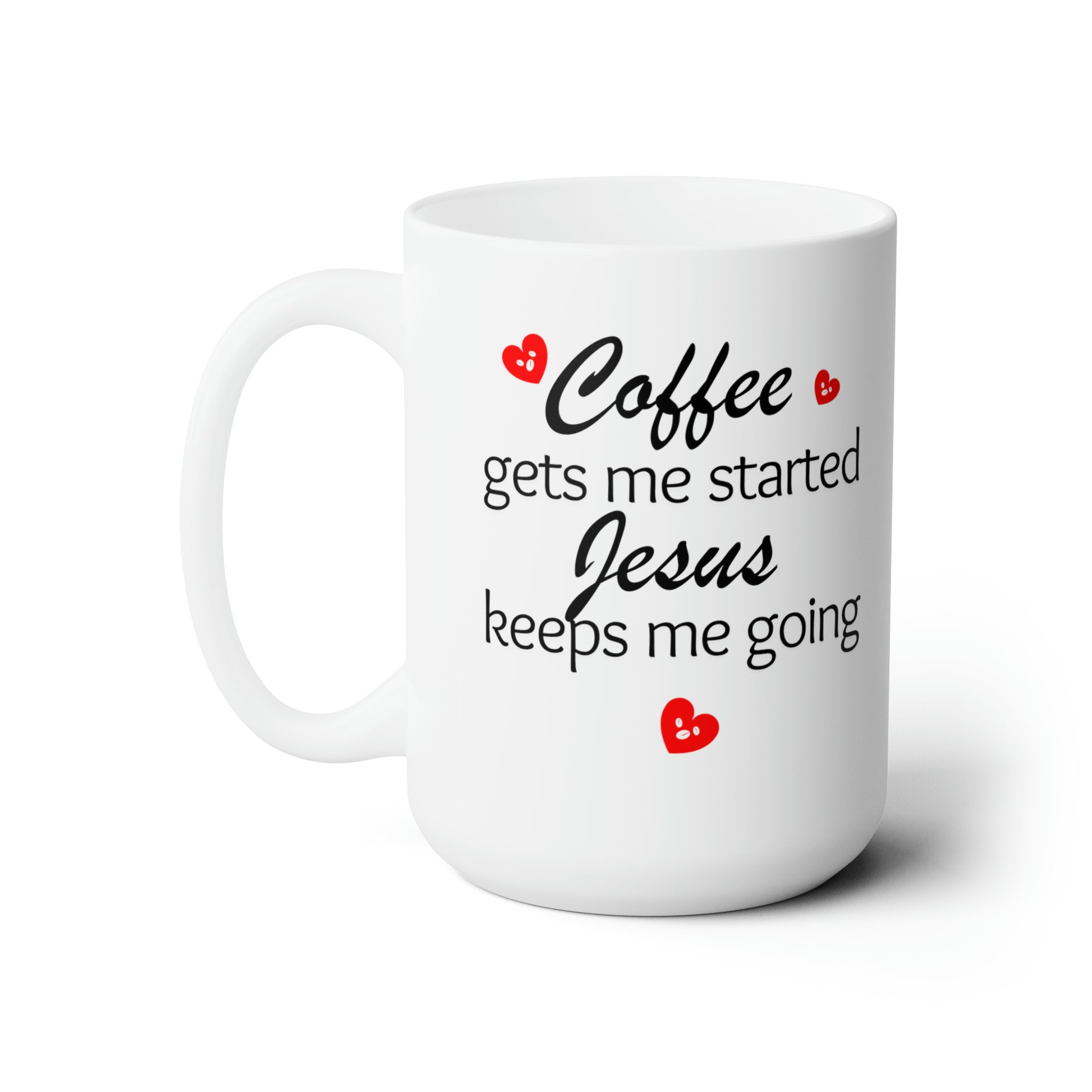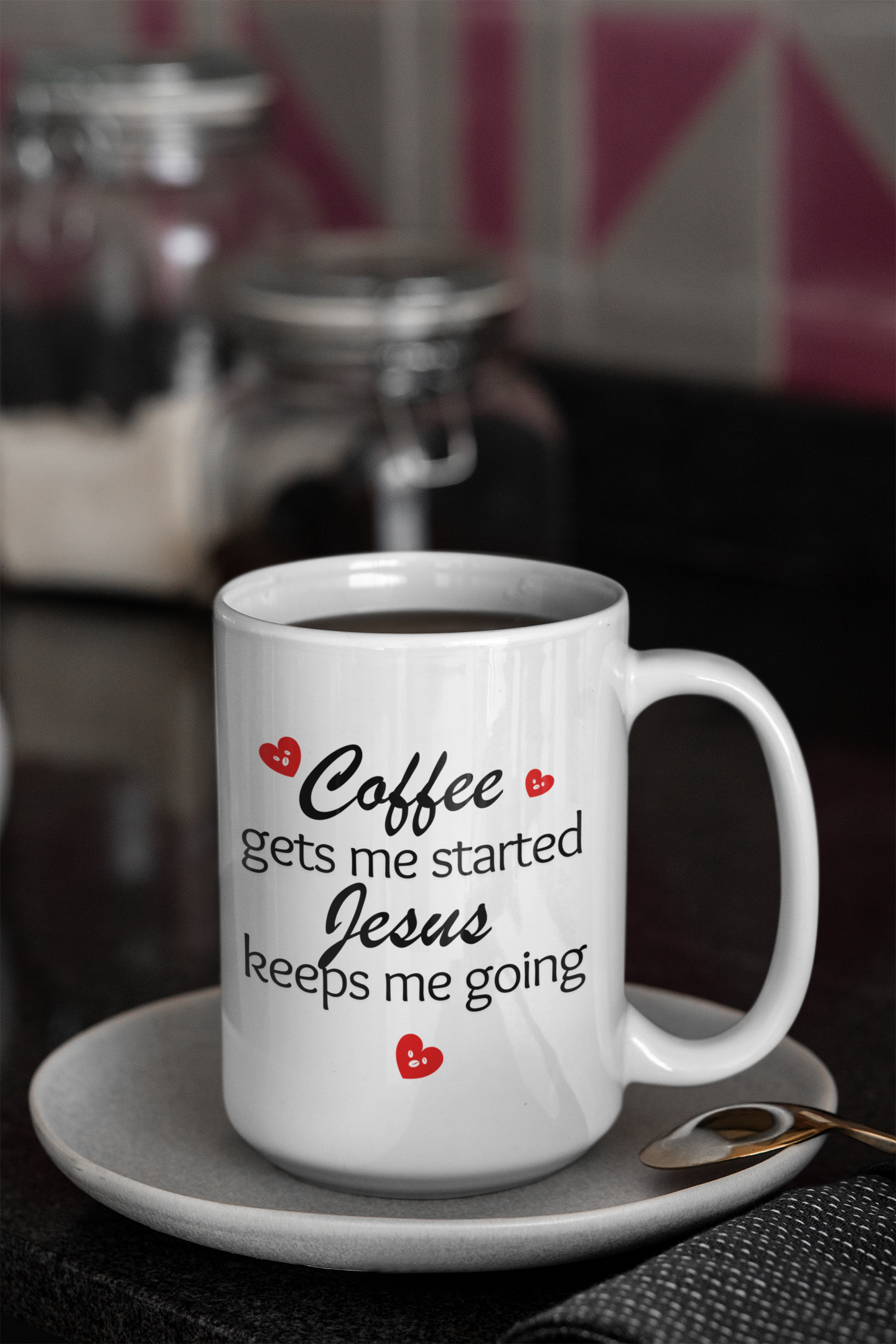 This charming mug, emblazoned with the saying "Coffee gets me started, Jesus keeps me going," beautifully combines faith and a love for coffee. This mug serves as an uplifting reminder of spiritual strength and personal faith with each sip. It's an ideal gift for coffee lovers, friends, or family members who cherish their faith and enjoy a warm beverage to start their day.