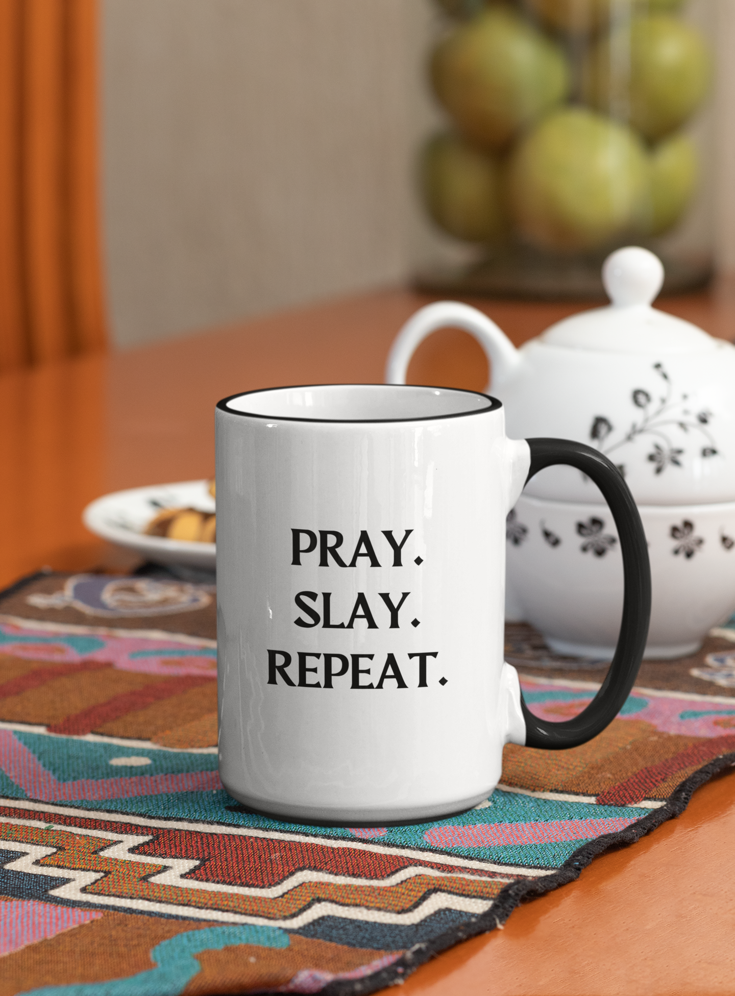 Pray. Slay. Repeat. Black Rimmed Mug, 11oz